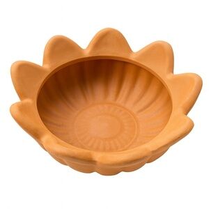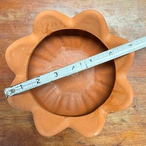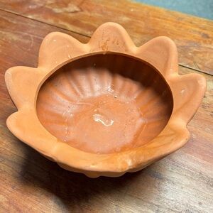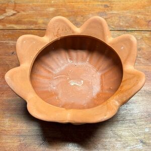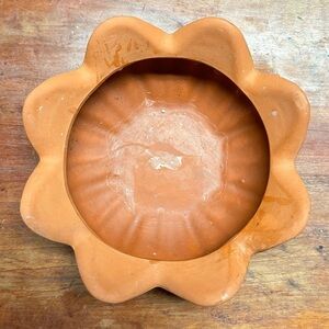 This vintage terracotta bowl from Tag features a charming flower design, perfect for adding a rustic touch to your home decor. With its earthy tones and handcrafted appearance, this piece is versatile enough to be used as a decorative centerpiece, a planter, or catch all dish for smaller items. Unique shape and natural imperfections that give it character.