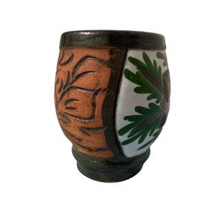 A carefully crafted vessel showcasing intricate floral artistry. Divided into white and terracotta sections, the vase features hand-painted botanical motifs with raised glaze techniques, creating depth and visual interest.
