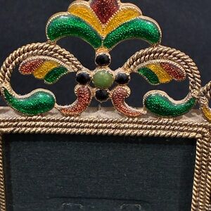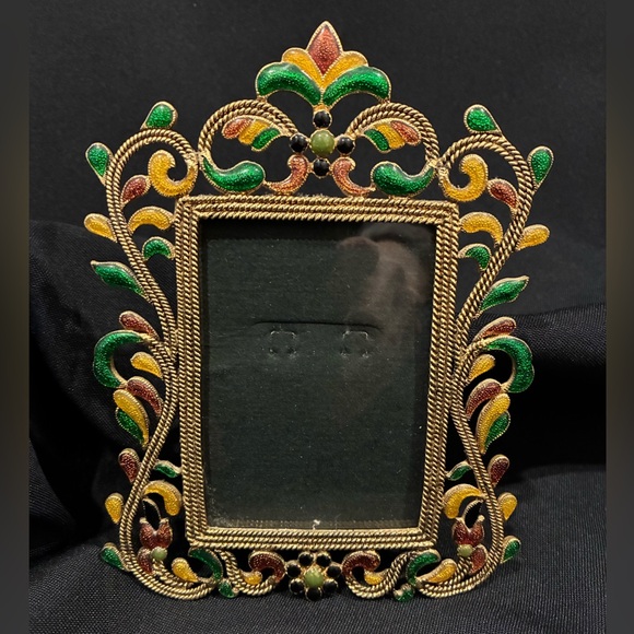 Enhance your home decor with this ornate multicolor metal photo frame. Featuring elegant green, yellow, and brown accents, this frame adds a touch of sophistication to any room. 4.5” wide and 6” tall.