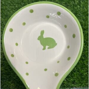NWT Terramoto Ceramic Easter bunny spoon rest. Green polka dots and bunny on a white background.