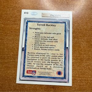 Collectible Terrell Buckley Rookie Force card. Features vibrant yellow and green uniform.