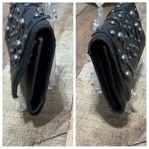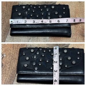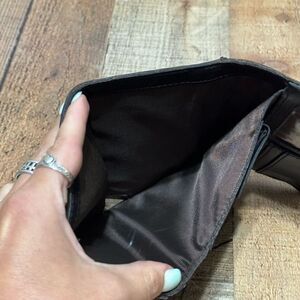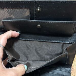 Interior: Opens to clear ID pocket, 9 credit card slots, center snap change pocket, 4 bill slots, leather lined