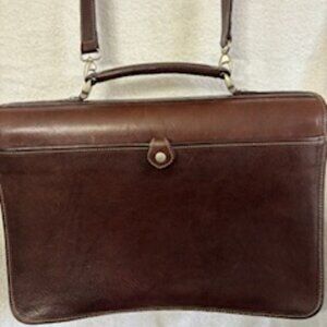 Terrida briefcase made in Italy with tobacco leather and a pony hair panel on the front. Removable (appx 37") leather strap and brushed nickel closure and hardware. Snap closure back outside pocket. Two sections inside plus zippered section and organizational pockets for business cards and pens. Never carried but slight transfer of leather stain onto lining in 2 places (pictured). Measures appx 16" across, 6" deep and 11" high