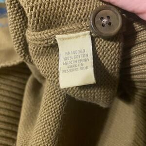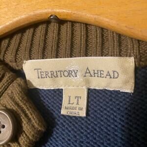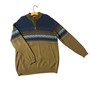 Classic Territory Ahead men’s knit henley sweater in a unique multi-tone color block design. Features shades of navy, olive, and light blue with intricate geometric stitching. Ribbed collar, cuffs, and hem. Soft midweight 100% cotton knit — perfect for layering in cool weather. Model image is AI generated for styling purposes. Actual sweater for sale is in other photos.
