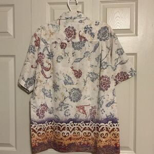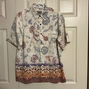 The Territory Ahead Men's Ethnic Hawaiian Cotton Blend Short Sleeve Shirt in size Large is a stylish and comfortable option for those who appreciate a touch of Hawaiian flair in their wardrobe. Made from a soft cotton blend material, this shirt features a vibrant multicolor Hawaiian pattern, short sleeves, and a button-up closure for a classic look. Perfect for casual or semi-casual occasions, this shirt is sure to make a statement with its unique design and tropical theme.