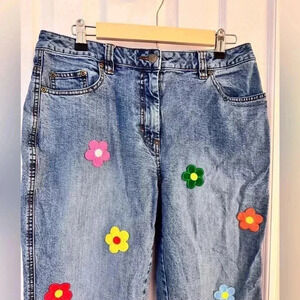 Territory Ahead Retro Straight Leg Embroidered Daisy Patch Jeans. Size women’s 12. Denim does not stretch. Bottom cuffs are distressed style. Excellent used condition. Measurements below.
