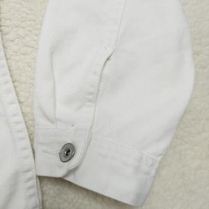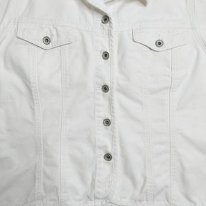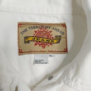 Womens white denim jacket by The Territory Ahead, size XL. Vintage piece from the 90s, made in Hong Kong. Has some loose threads on the top stitching (photo 3). Heavy weight 100% cotton denim, easy to bleach, dye, and customize or wear as is.