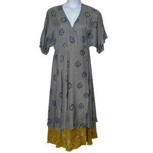 Territory Ahead Wrap Maxi Dress Womens 16 Geometric 100% Silk Gray Blue Yellow