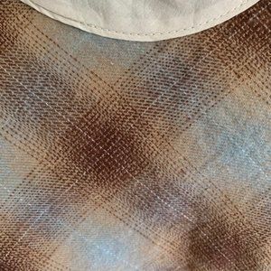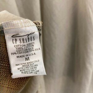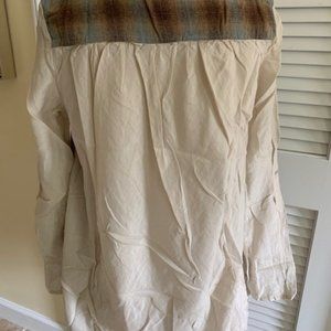 (1) Unique new brown shirt from CP Shades was purchased from Sundance Catalog. Marked size medium. Model is wearing same shirt in blue, this listing is for the brown shown in rest of photos. It has a High Low hem. Shorter in the front and alot longer length in the back. Lightweight & designed to be loose fitting. Has nice flowy swing to it. Body seems to have generous fit & sleeves are more fitted (skinny). Sundance described as "soft and hazy plaid come together with color blocked sleeves and feminine scoop neck." Jersey portion 100% cotton; cotton silk portion 70% cotton/30% silk. Marked size Medium. This is an older style that was called Jaci and retailed at Sundance for $185. Price not marked on plastic bag. Has wrinkles from storage..