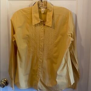 The territory ahead top. Button down. Lovely crochet detail. Excellent condition. Butter color. 25 1/2 inches long armpit to armpit 20 inches wide. Great color for Fall. Seasonal.