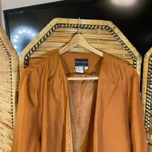 Gorgeous Terry Lewis Classic Luxuries 100% silk duster coat in a rich rust copper hue. Features an open front design with subtle lapels, side pockets, full satin lining, and a softly draped silhouette. Perfect for adding an elegant touch to fall and holiday looks—pairs beautifully with denim, dresses, or evening wear.