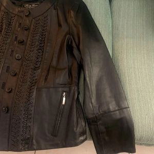 Black 100% leather Terry Lewis Classic Luxuries jacket. Size Small. Hidden inside pocket. Crisscross design on both sides vertically. Medium weight. All working zippers. Brand New. Never worn. Closet hung. Smoke free home.