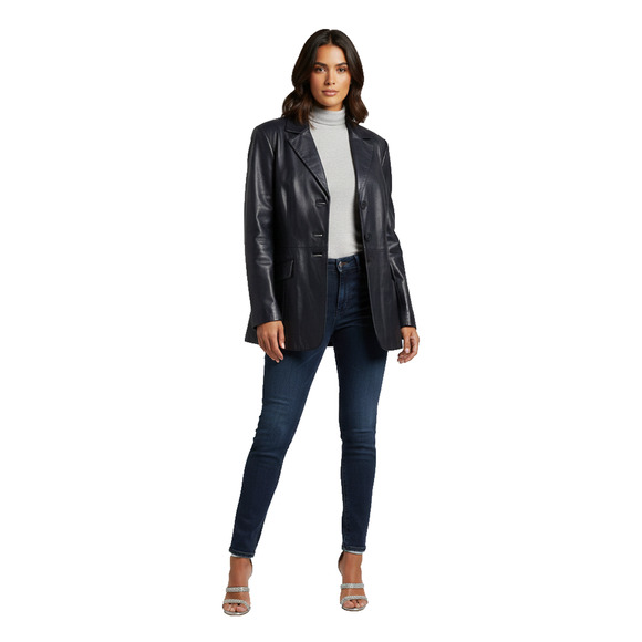 The Terry Lewis Navy Blue Leather Blazer Jacket Coat is a stylish and classic piece perfect for any conscious fashionista. Made of 100% genuine leather, this mid-length jacket features a solid navy blue color with long sleeves and a button closure. The jacket is ideal for casual occasions and is designed in a plus size 3X to fit women comfortably. With a polyester lining and insulation material, this jacket is perfect for the winter, fall, and spring seasons, adding a touch of sophistication to any outfit.