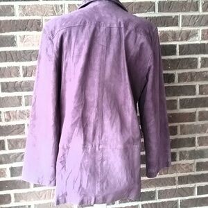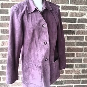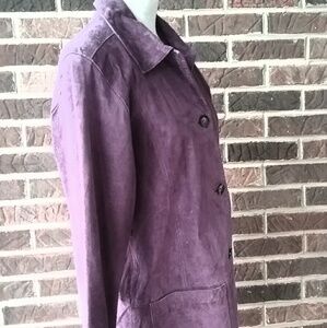 This jacket is pre owned but in excellent condition. It is an eggplant color and have two front pockets. It is a good weight but not heavy too heavy. This jacket has a good feel and great body .