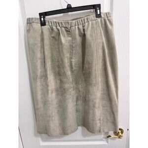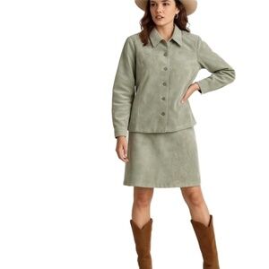 Beautiful two piece set with a jacket and matching skirt in a lovely sage hue. Crafted from 100% genuine leather, this piece showcases delicate floral embroidery and a chic collared design. Perfect for making a stylish statement any season.