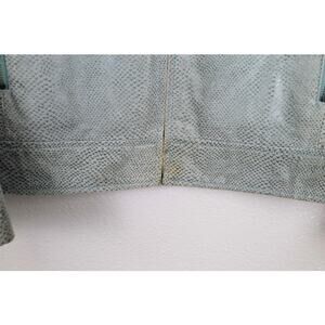 Terry Lewis Classic Luxuries Genuine Leather Suede Cropped Bomber Moto Sea Foam Green Suede Snake Print Jacket with Zip Front, Zip Pockets, Zip Sleeve Cuffs. Round neck, no collar, Fully lined. Perfect Spring, summer jacket. Approx 22in pit to pit, shoulder to shoulder 17in, shoulder to hem 23in. Beautiful jacket, some spotting, see close up photos.