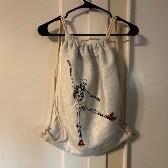 Stylish drawstring backpack with a skeleton print. Features red accents on the design by Terrytown.