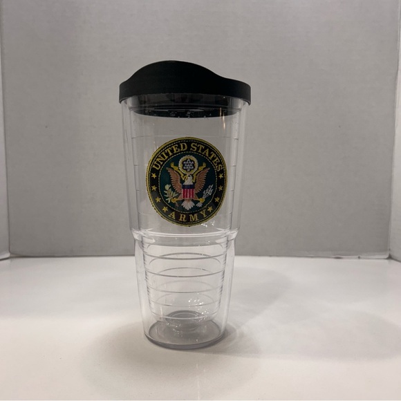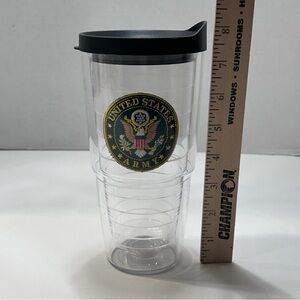 Pre-owned US Army Tervis 24 Oz. tumbler. Embroidered patch in tumbler wall. Use for hot or cold. Spill proof lid. Normal signs of wear on cup. Nice cup to show your Army pride!
