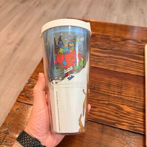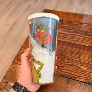 Bring holiday cheer to your sips with this Tervis Dr. Seuss Grinch “Grow Your Heart 3 Sizes” 24 oz Insulated Tumbler with Travel Lid. Featuring a whimsical wrap-around design of the Grinch in a Santa hat grinning mischievously, alongside his loyal dog Max dressed as a reindeer with antlers, a red heart emblem, snowy mountains, and the iconic phrase “Grow Your Heart 3 Sizes” in bold red lettering—perfect for fans of How the Grinch Stole Christmas. Crafted with double-wall insulation to keep drinks hot for hours or cold all day, this shatterproof tumbler reduces condensation and prevents table rings. Made from strong, impact-resistant BPA-free plastic that won’t retain tastes or odors, it’s microwave, freezer, and dishwasher safe (top rack recommended) for easy care. Proudly made in America with a lifetime guarantee against defects. Fits most cup holders for on-the-go use. From a smoke-free, pet-free home in excellent gently used condition—no cracks, scratches, or fading visible. Ideal for Christmas gifts, daily coffee/tea, or festive hydration.