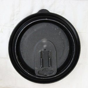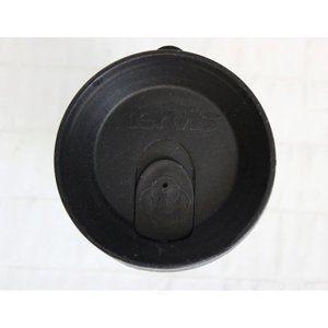 Slide open lid with the logo on the slide and a hole for ventilating drinks