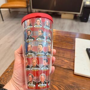 Honor American history with this Tervis US Presidents 24 oz Insulated Tumbler, featuring portraits, names, and terms of office from George Washington (1789-1797) to Barack Obama (2009-2017) in a red, white, and blue patriotic design with stars. Includes two interchangeable travel lids—one red and one blue—for versatile use. Double-wall insulation keeps drinks hot or cold for hours, reduces condensation, and fits most cup holders. Made from durable, BPA-free plastic that’s shatterproof, microwave-safe, freezer-safe, and dishwasher-safe (top rack). Proudly made in America with a lifetime guarantee. From a smoke-free, pet-free home in excellent gently used condition—no cracks, scratches, or fading. Perfect for history buffs, collectors, or everyday patriotic sipping—ideal gift for Presidents’ Day or 4th of July!
