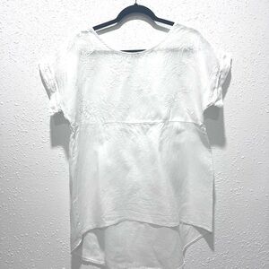 A white, short-sleeved, high-low hem tunic blouse made of 100% linen, by the brand Terzo Millennio from Italy.