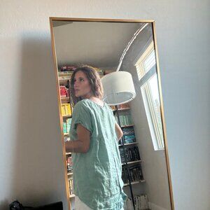The drama of a high low is exactly what you need for your closet. This 100% linen Terzo Millennio tunic top has a 6 button panel and pleats in the back for a custom look. Front had short drop sleeves. Made in Italy. Color: SAGE Size: M
