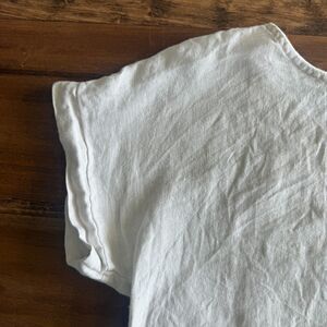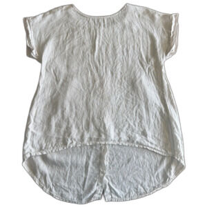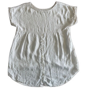 Short sleeve, wide neck, high-lo hemline, back button closure from hem to mid back, shell buttons, cream/light tan.