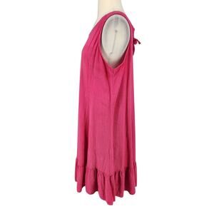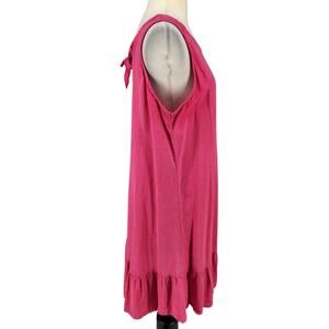 This Terzo Millennio dress features a vibrant pink hue in a textured linen-cotton blend. Designed with a scoop neckline, sleeveless silhouette, and a ruffled hem, it’s finished with a dramatic bow tie and keyhole detail at the upper back. The relaxed fit and breathable fabric make it ideal for warm-weather styling. Pair with a woven sandal or oversized tote for a look that channels effortless summer energy.