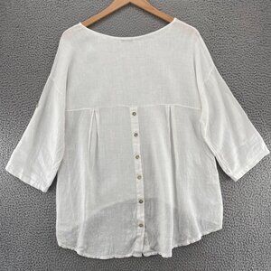 Terzo Millennio Top Womens Medium White Linen Long Roll Tab Sleeve Hi Low Tunic