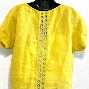 Terzo Millennio Woman 100% LINEN Yellow Back Stripe Lace Top Blouse ITALY Size S