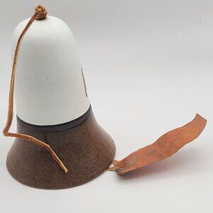 This two-toned cream and brown Southwestern motif ceramic wind bell by Tesa depicts a petroglyph style bird. It includes a copper tag hanging from the clapper. The leather hanger can be knotted at whatever length you desire. Minor surface scuffs, no chips or cracks.