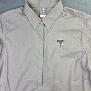 Tesla Shirt Womens L Gray Button Down 3/4 Sleeve Embroidered Logo Stretch Moto