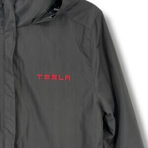 The outer shell is black, hooded and has TESLA embroidered on it