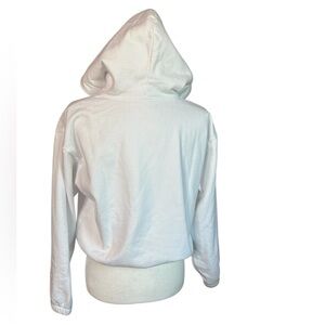 Elegant white cropped hoodie with front zipper and drawstrings and kangaroo front pockets. Comfortable and stylish.
