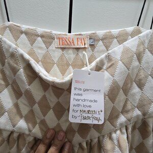 Tessa Fay dresses are created from reclaimed upholstery fabrics. This dress is made from a thick cream and light brown diamond print fabric, which makes it suitable to wear all year round.