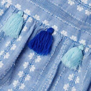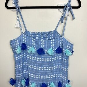 Lightweight and fashionable Lola dress adorns tassel embellishments throughout and ties at shoulders.