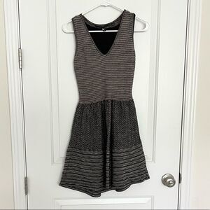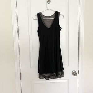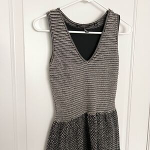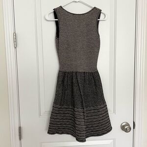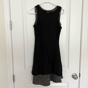 Black and beige with flecks of silver. Excellent preloved condition. Blend - cotton/wool/rayon/poly and metallic. Attached rayon knit slip. Per Anthropologie - 'Layered and lined with layers of lines, this silver-flecked dress is an achromatic success. Pullover styling. 16.5" pit to pit. 52" overall length.