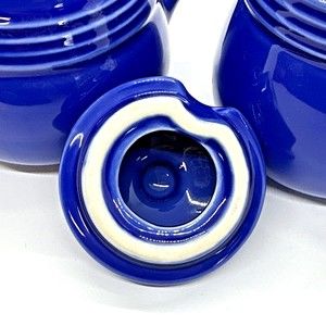 Test Rite International Cobalt Blue Stoneware Sugar & Creamer set. Great Condition. Some wear on bottoms. See pictures for details. 3.5 in tall for both creamer and sugar (without lid on) 4 in with lid.