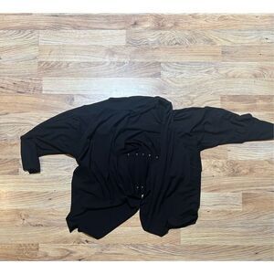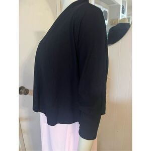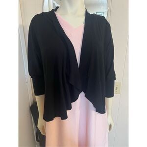 Another piece straight out of my closet. I love this little jacket topper, but I cannot keep all these clothes. I am at my wits and I can’t even fit things in my closet anymore! This is an oversized size small soft and stretchy just the thing to throw on over just about anything to dress it up. This is a rayon spandex. Blend to wash in cold water and hang to dry. It’s an open front with sleeves that could be puffed up a bit and a pleat detail in the back with studs. Just a really versatile piece to keep in your closet to jazz up just about anything no flaws whatsoever.