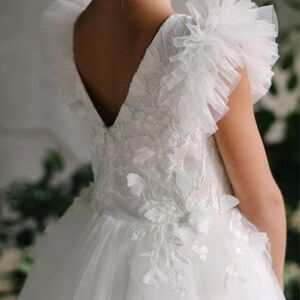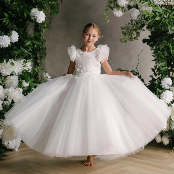 This graceful communion dress features a three dimensional floral bodice with puff tulle sleeves and straight tulle bottom.