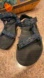Used Teva Style 6584 Sandals. I feel they are great for in the Water, Walking, Hiking or just for use as everyday Sandals. They have Velcro closures. Blue Black Gray. U. S. 11 Mens. These are in used condition showing all over wear from use with imperfections but they should still have some life left in them. They have age to them. One is more worn than the other-especially noticeable on the heal padding. Please look at pictures closely. They are dirty/discolored but I did clean them and I sanitized them. My husband loved this style for years and had several pairs but he doesn’t wear this style any more. I am listing two of the pairs. As I said they are used and show wear and they have imperfections. There is stuff still stuck in the Velcro. Measurements are very rough to give an idea of size. Colors may be off because of lighting. Listing B