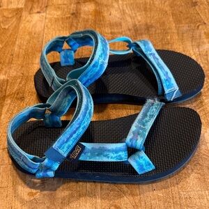 Comfortable Teva sandals with aqua straps and black soles. Ideal for everyday adventures.