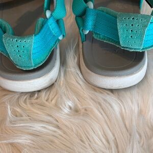Comfortable Teva sandals with aqua and light blue straps. Ideal for everyday wear.