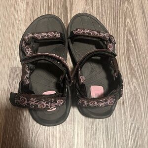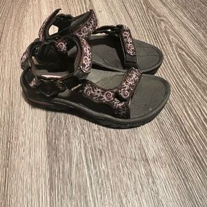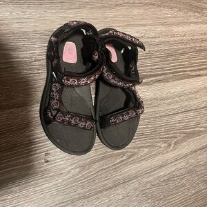 Step into comfort and style with Teva's Black and Pink Adventure Sandals, perfect for outdoor escapades. These sandals feature adjustable straps for a personalized fit and a robust footbed designed to support your every step. Ideal for hiking or casual outings, they combine functionality with a touch of flair.