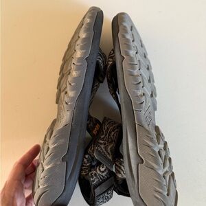 Comfortable Teva sandals with a black and white pattern. Ideal for everyday wear.