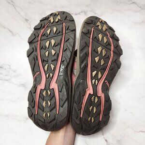 These Teva hiking sandals feature a tan and coral color, slip-on style, non marking soles, comfort footbed, and are perfect for any outdoor activity!