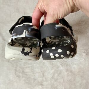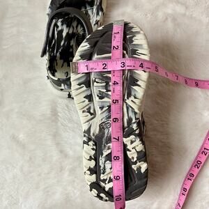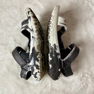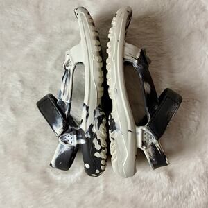 Super comfy, lightweight and supportive sandals for all-day wear, getting around town or even water activities. Fun pattern in a black and white swirled marble. Easy hook-and-loop closure comes on and off quickly and gets the fit just right. These have been lightly worn and are in great condition. The size is a women's 7 but runs a little big and will fit an 8 also. Measurements included in photos.