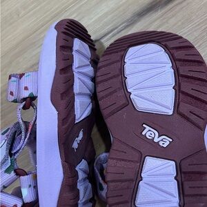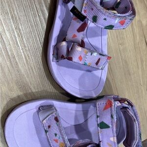 Super cute Teva size 4 toddler sandals. Adjustable strap. Hardly worn- my little one outgrew before she could really wear them. Fun and comfy sandals with adjustable straps. Ideal for playtime.