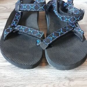 Black with blue, green, and purple pattern on the straps. Velcro closure.